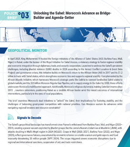 Morocco is redefining its role in the Sahel through a $25 billion gas pipeline and Atlantic port access, filling the void left by Western powers. Can Rabat’s economic diplomacy outlast regional instability? GGSF Policy Brief No. 03 analyzes the stakes.